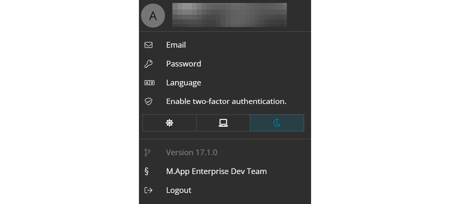 The username and the underlying email address appear next to the circle symbol with the number. By clicking on Email or Password you can change either of these for the current user you are logged in. Also the language is an adaptable feature that can be set here. If desired you can enable two-factor authentication as security mechanism. Change from dark mode to light mode or vice versa. And finally there is also a logout button to end your session. It will forward you back to the login mask.