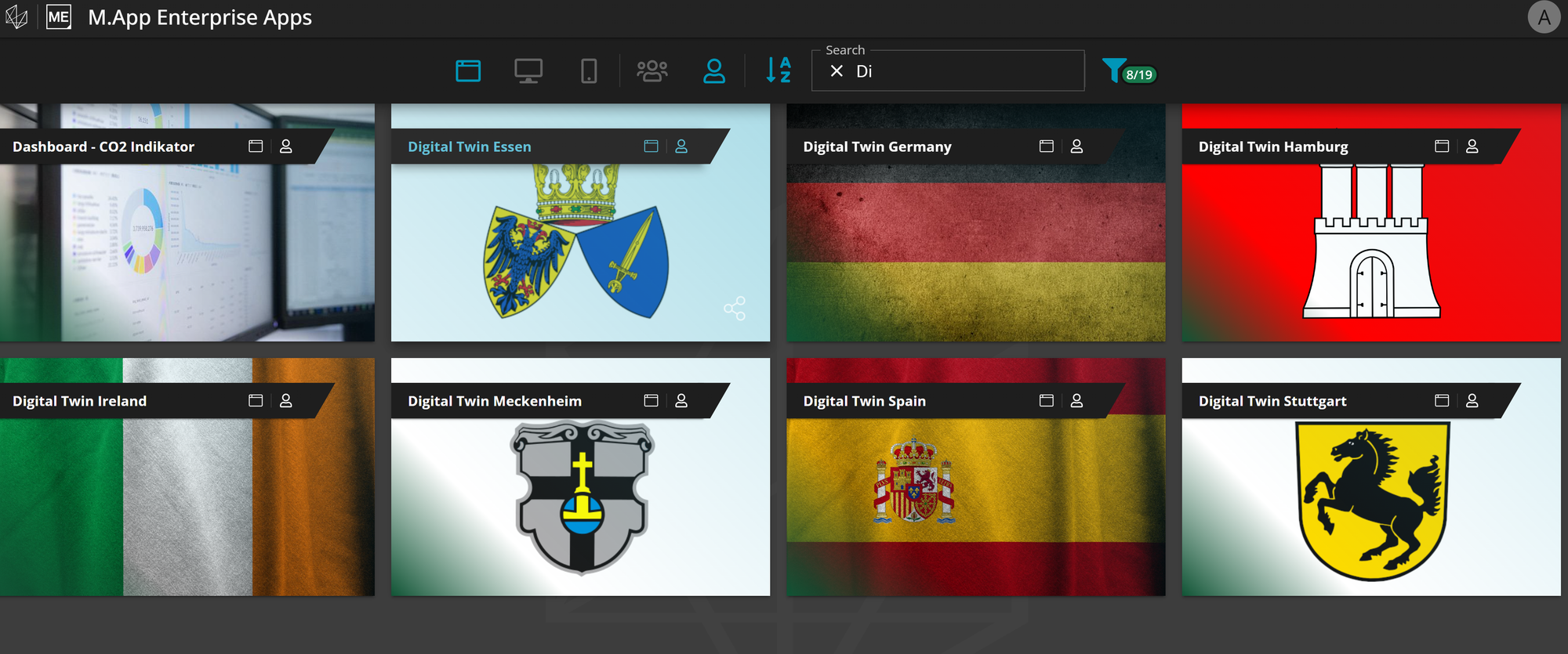 After the login you will be directed to the app page and the accessible apps for your user. The selection of apps may look like the example below. The apps page lists all existing apps that can be visited by the respective user. This includes browser apps, desktop apps and mobile apps.