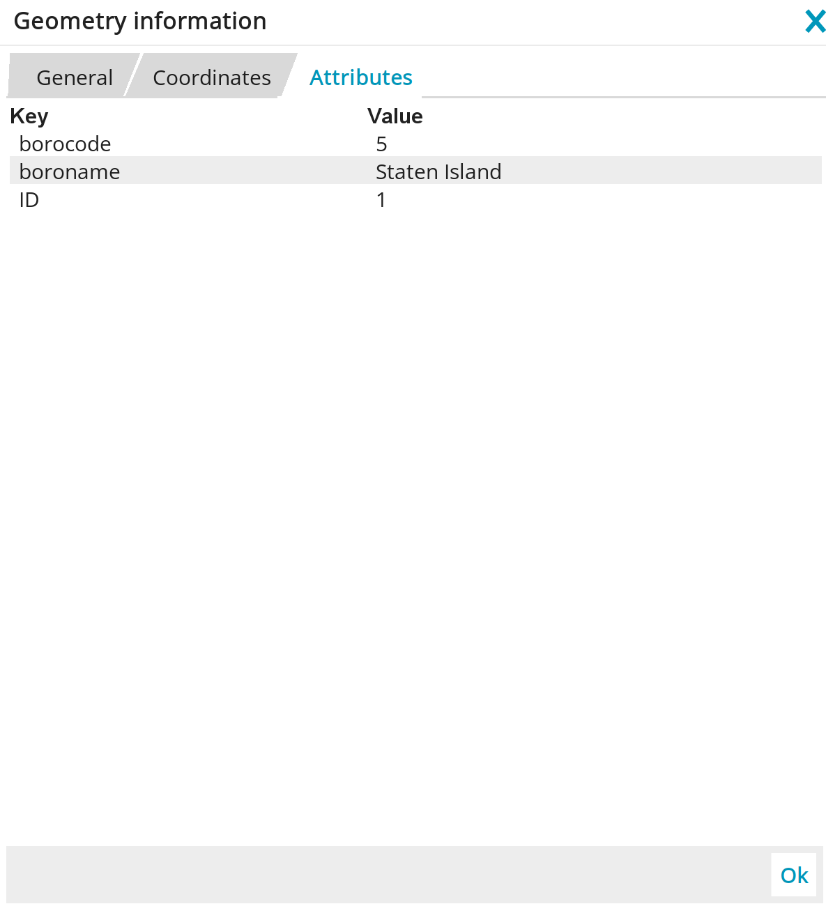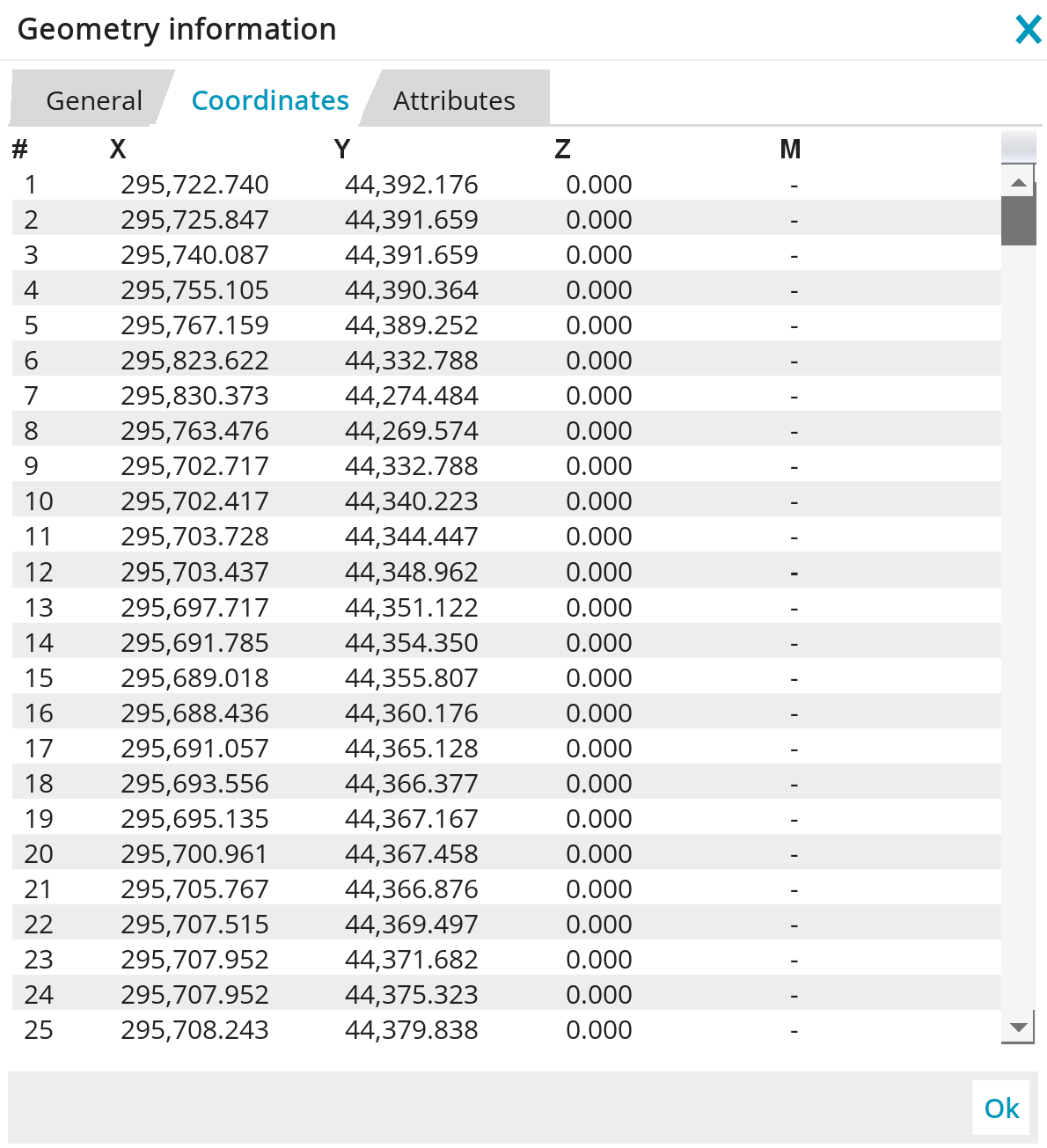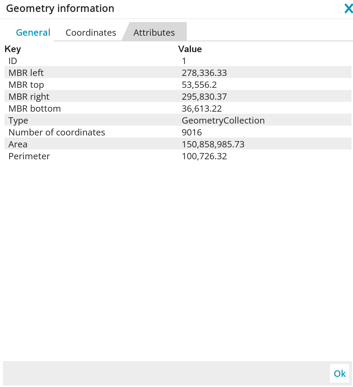 Select Geometry information to open a window with detailed information about the selected geometry. As indicated in the images below, the information provided includes general information, information about the attributes and the exact coordinates of all nodes of the respective geometry