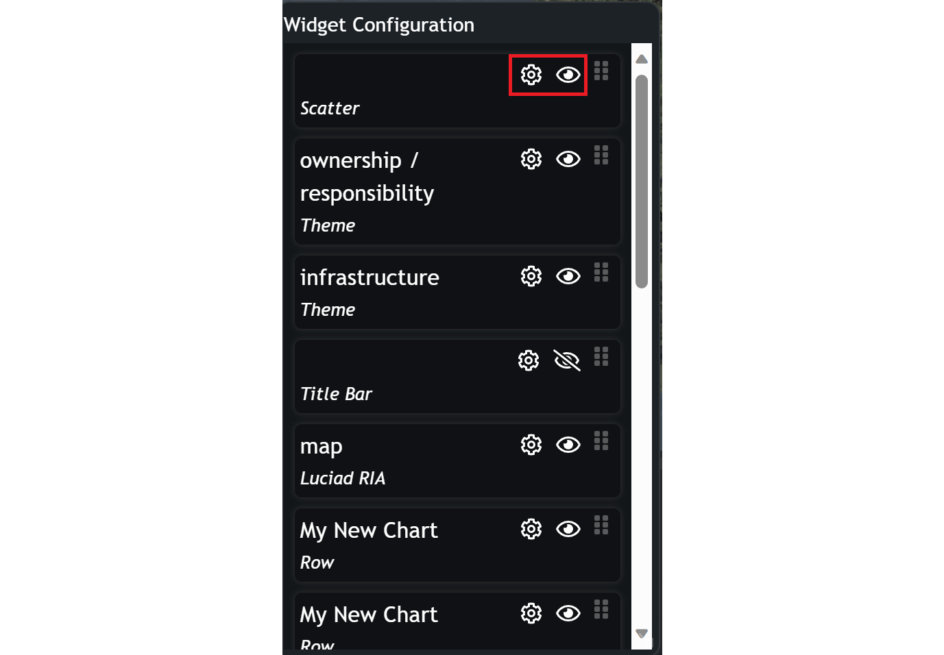 Clicking on the wheel icon will get you back to editing a widget. The eye icon enables you to set your widget invisible/visible.