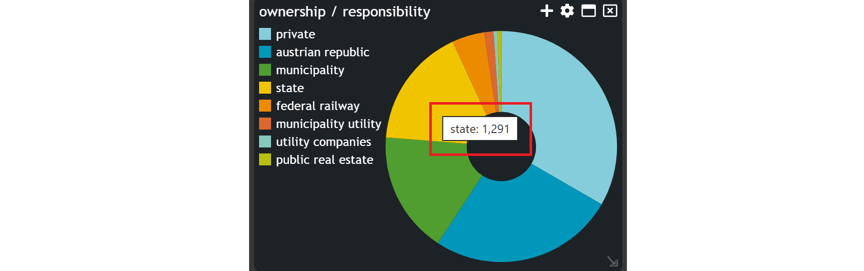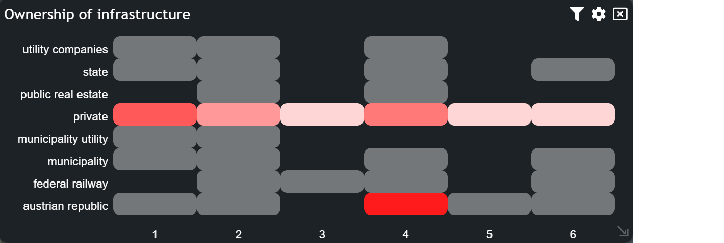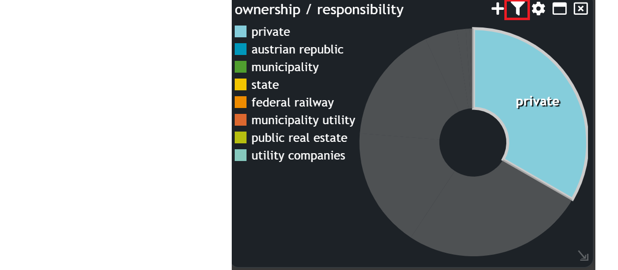 Many graph widgets offer the possibility to be filtered. Just by clicking on a part of a widget, like the slice of a pie chart or a field in the matrix of a heatmap chart, this part of the data is selected. This triggers a filter for all other charts connected by the same dataset and it will grey out the other fields of the chart itself. It is possible to select/filter as many parts of your widget as you desire. To remove the filter, just click on the selected part of the chart or use the icon in the top right corner that looks like a cone, to reset all filters.