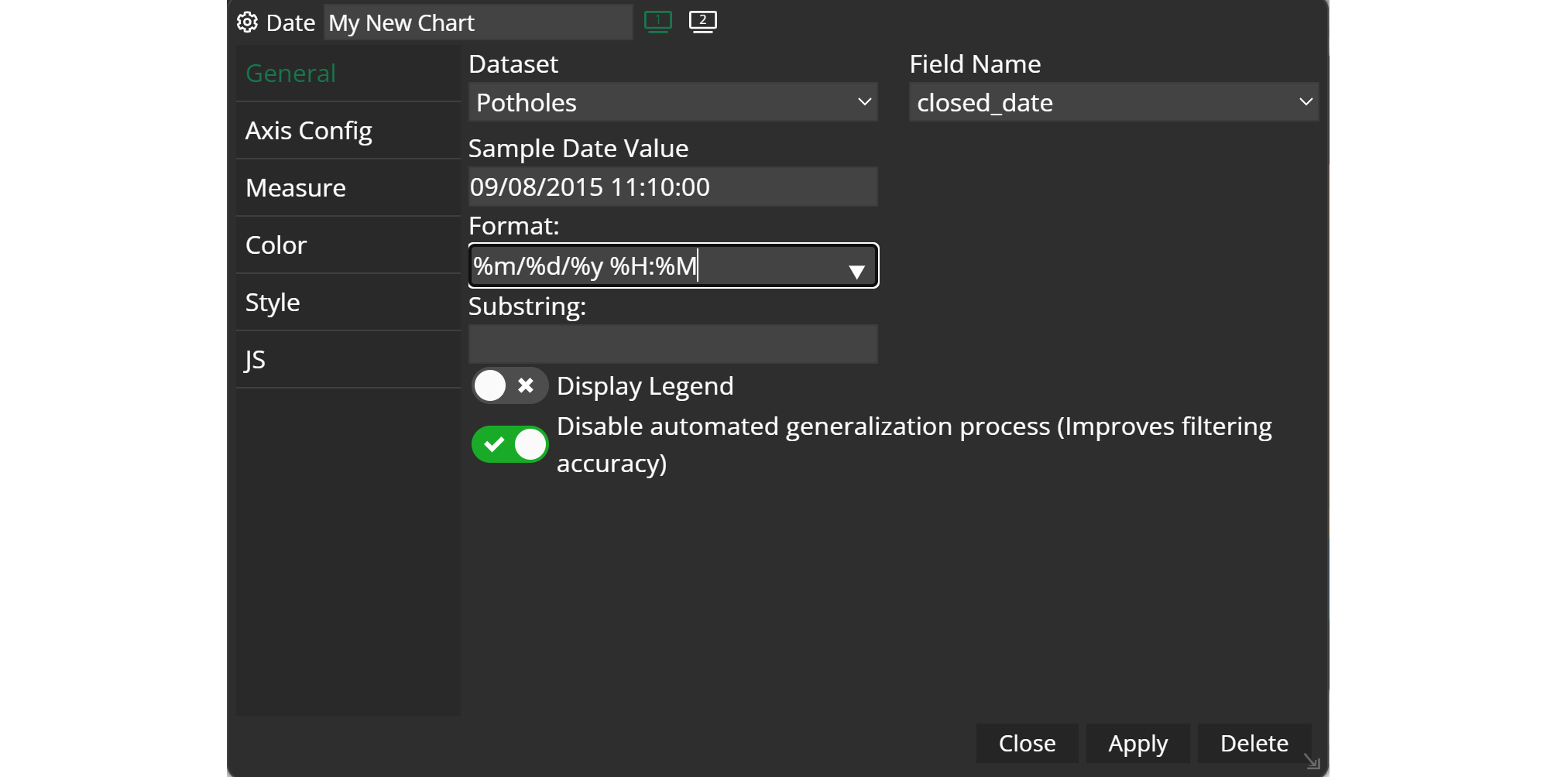 formatthat best suits your needs (For Example: %m%d%Y). Accordingly to your choice, a sample of your dataset will be displayed inSample Date Value. - Decide the