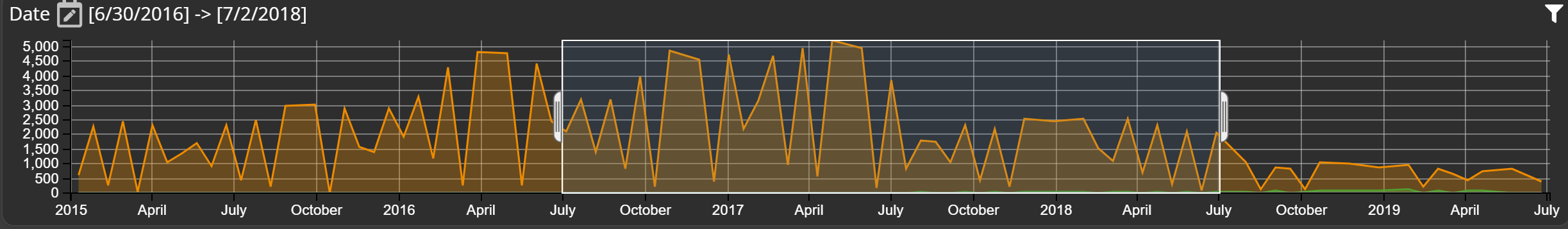 Once your date range is applied, the range is displayed in your widget too and can be changed by dragging the filter frame. The start and end dates of the selected date range filter are shown in the chart title, providing you with a clear reference for the filtered data.