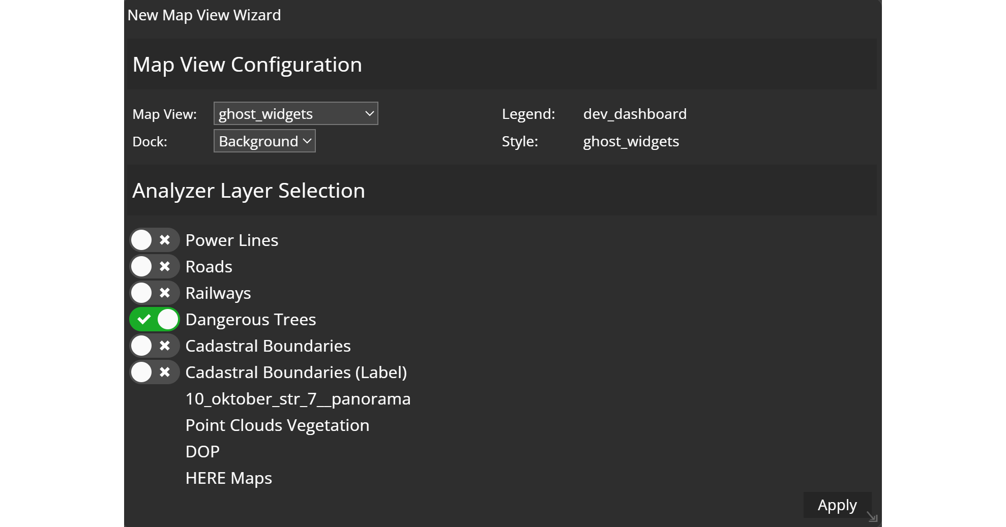 Once you click on it, you will get to the same configuration window as in the map view wizard mentioned earlier in this post. Make your desired map view settings and choose your analyzer layers.
