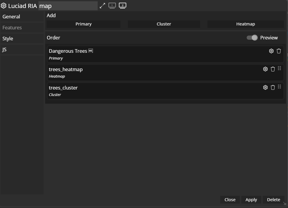 However, there are more options in Luciad RIA when you move to the Features tab. You can add a Primary, Cluster or Heatmap to your map view.