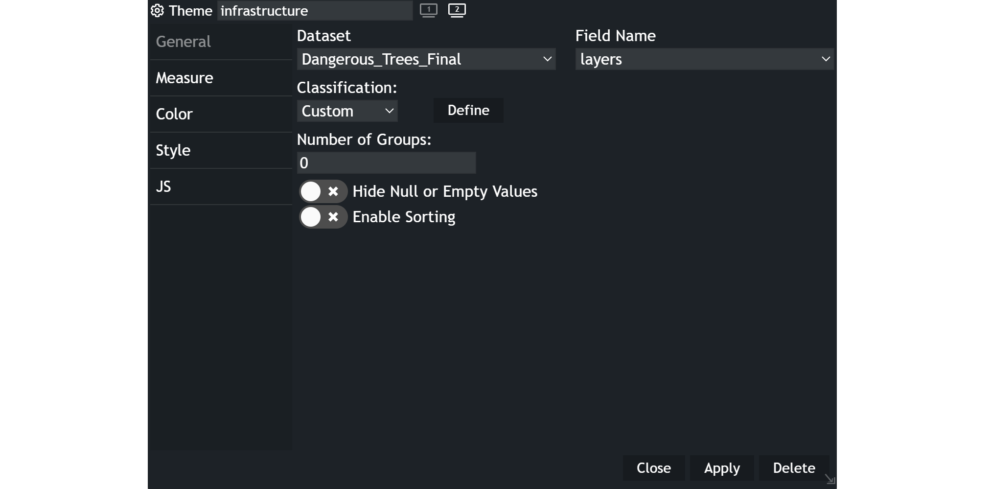 The Theme chart simplifies data exploration and aids in analyzing feature distributions by using customized colors. It is possible to match your map view styling with a theme chart.