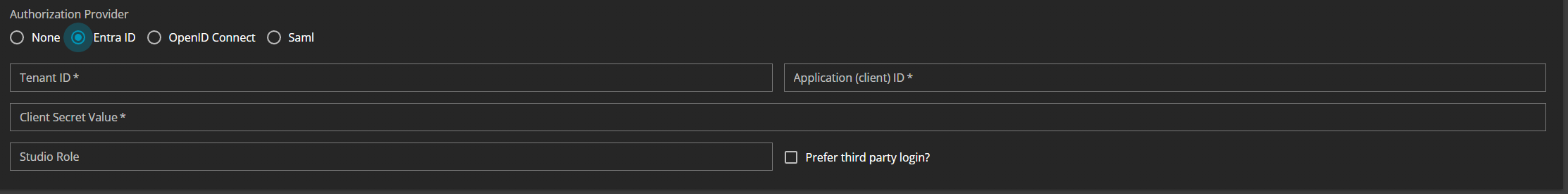 Studio Role: Users are normally allowed to authorize themselves into a tenant’s Apps context with the third-party authorization protocol.Studio Roleis a shared setting between all third-party authorization protocols which allows a tenant’s Studio context to be authorized with the selected protocol too, if the authorized user has a role value corresponding to the value specified in this field. In the case of Entra ID, the Identity Provider should insert this value with the keyroleorgroupas a key-value pair in the returned authorization token.Prefer third party login:If you want to prefer the Entra ID login over the on-premise login defined in the tenant