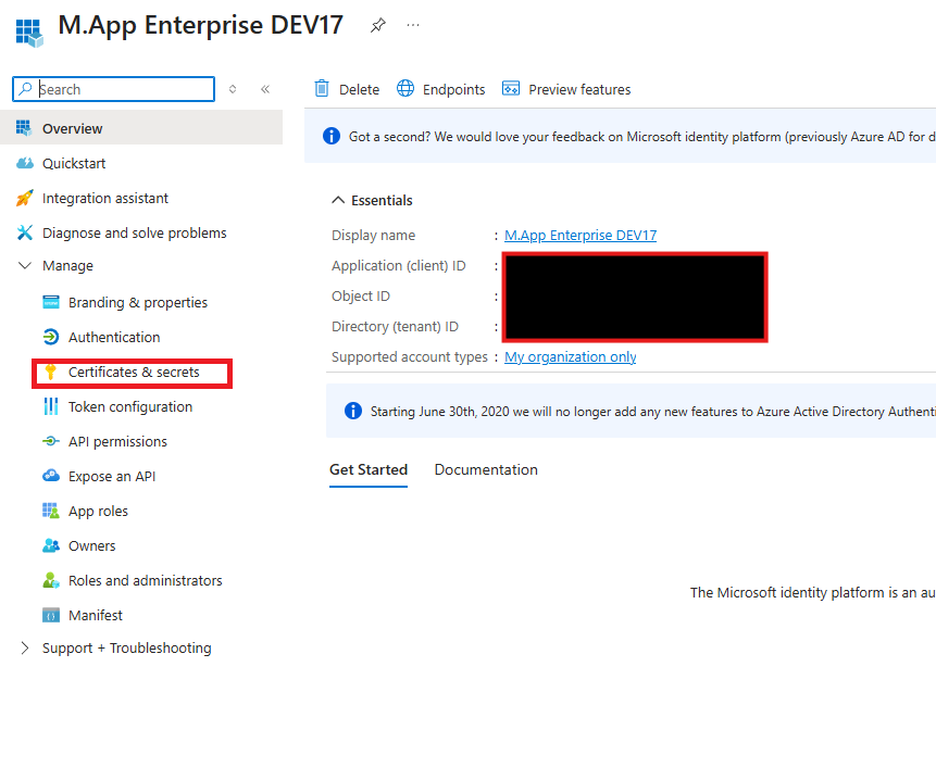Tenant ID:You will get the information on the start page of your applicationApplication (client) ID:You will get the information on the start page of your applicationClient Secret Value:You can create the secret ID atCertificates & Secrets