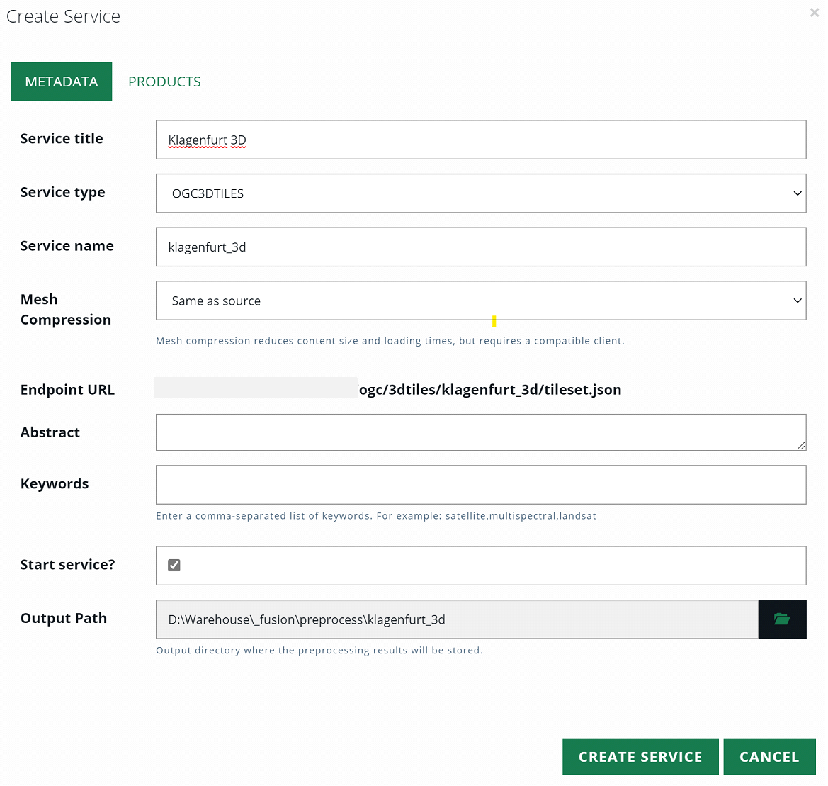 Here you can specify the service title and the service type. The latter one, in case of 3D tiles, has to be be "OGC3DTILES. Finally, create the service!