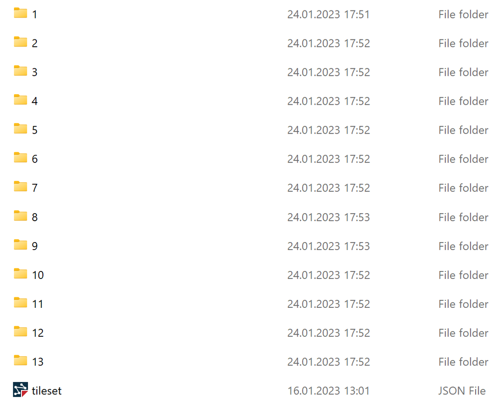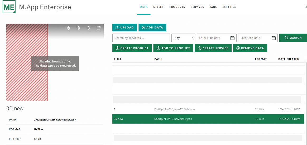 On the data page you can observe all the imported data. Let's assume you have added 3D Tiles which are stored in the folder "3D_new", you would see the appendant JSON file with metadata tile information.
