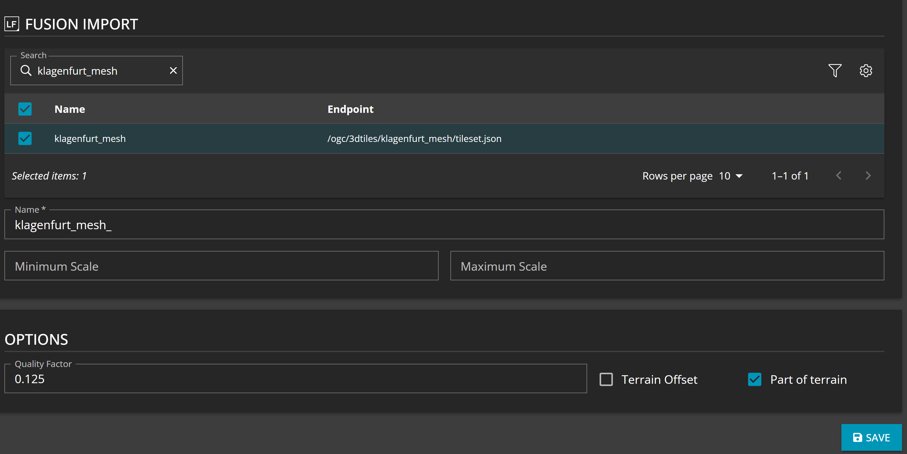 Now, that the data is crawled from the desired folder location, you can already create a service. In case of 3D tiles, you mark the corresponding JSON file and click on "Create Service".