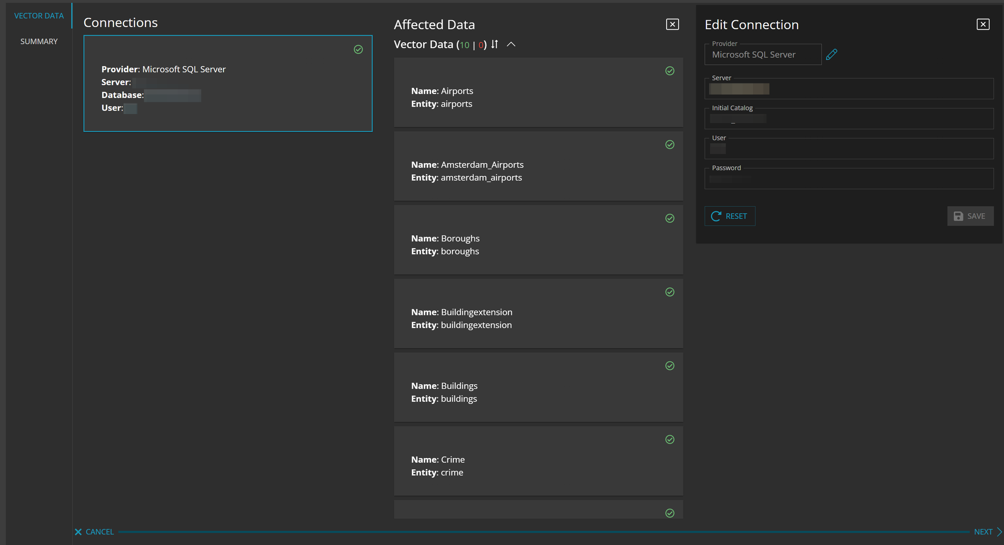 Initially, a window will display the connections utilized for vector data, with a green checkmark indicating that all connections are valid. In the right colum you can edit the connection and its properties.