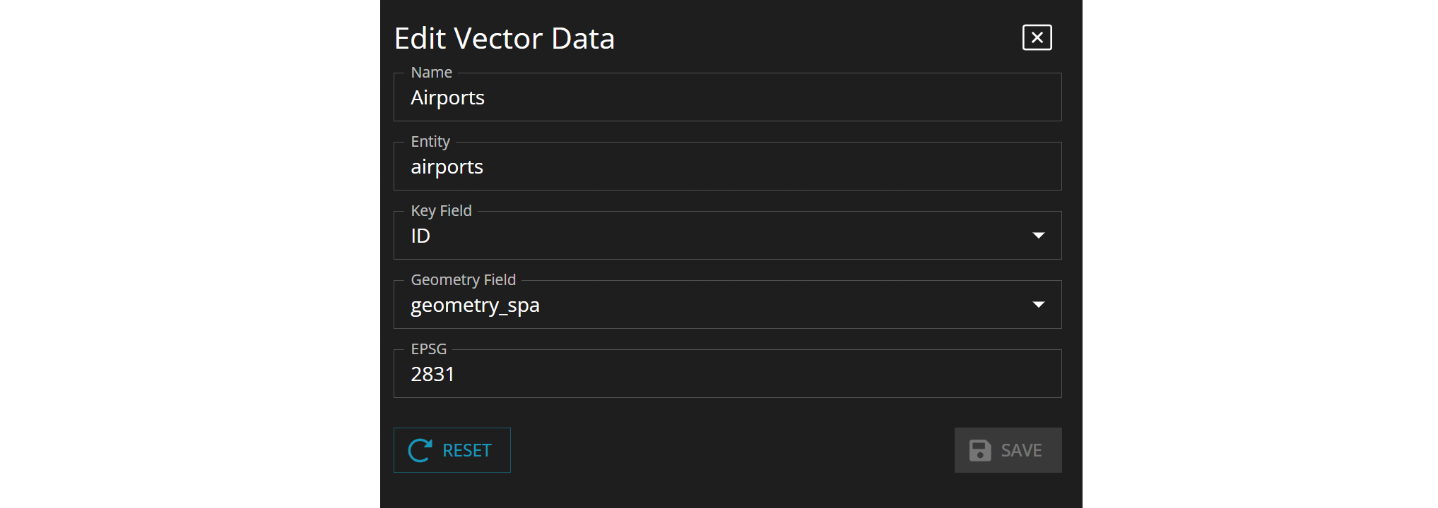 You can modify each dataset by adjusting its name, entity, key field, geometry field or EPSG code. The reset button enables you to restore the original settings.