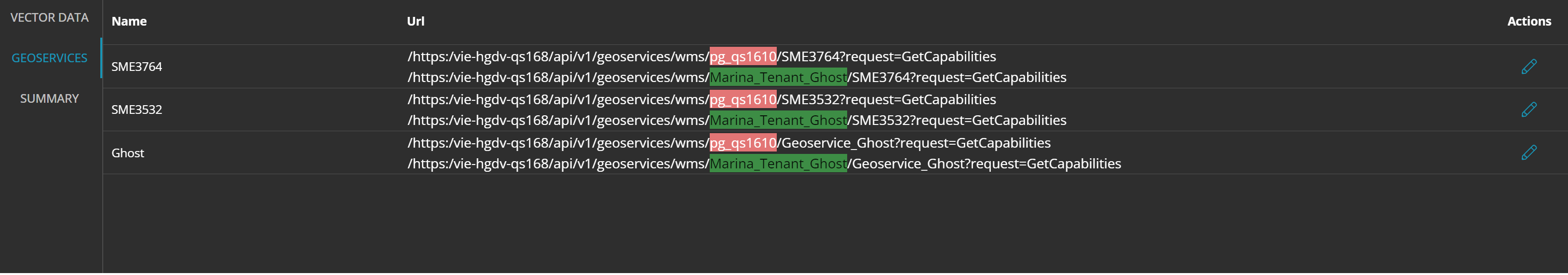 In case your imported tenant includes MyGeoservices, they will be listed in the Geoservices section on the left. When you click on it, you will see the original connections of them and the new connections for the tenant to be created. Differences between the paths of the original and new connections are highlighted in red and green.