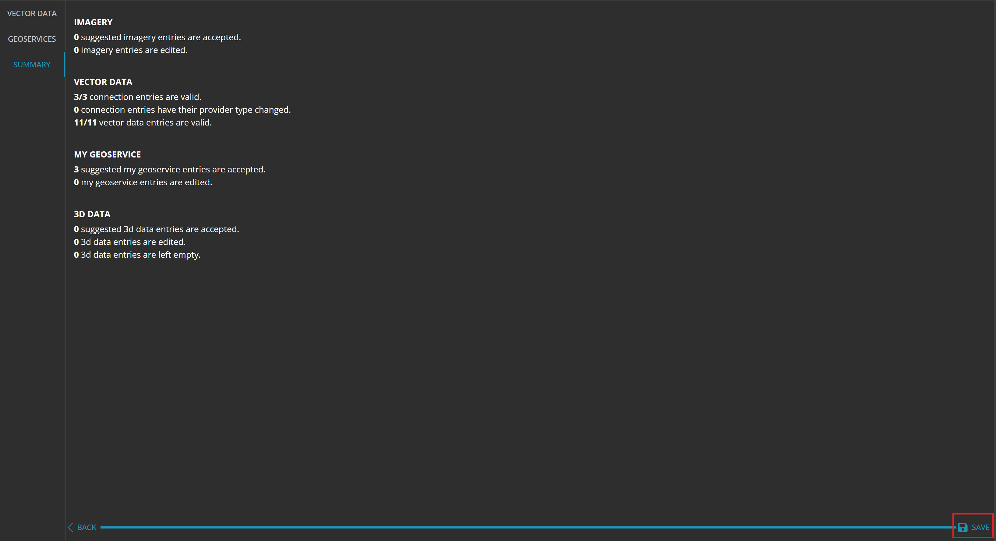 Upon saving the input form for a new tenant, the import wizard will open automatically. On the far left, there's a column featuring various data types such as Vector data, Imagery, Geoservices, 3D, and Summary. In the provided example below, the imported tenant includes only vector data, thus the other categories are absent. So dependent on your imported tenant, you will see more or less categories.