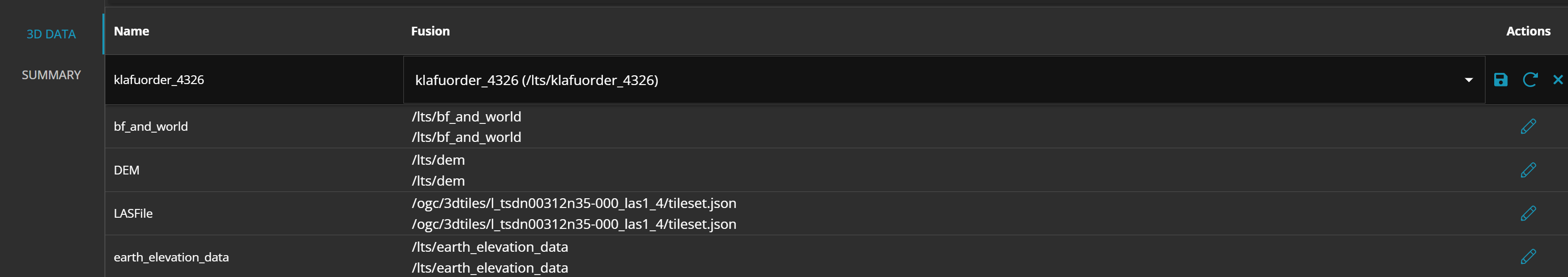 The 3D Date section of the menu on the left will appear when 3D data are present in the imported tenant. Any OGC-3D Tiles, elevetion data or panoramics will be shown in the list and their paths can be modified via the pen icon.