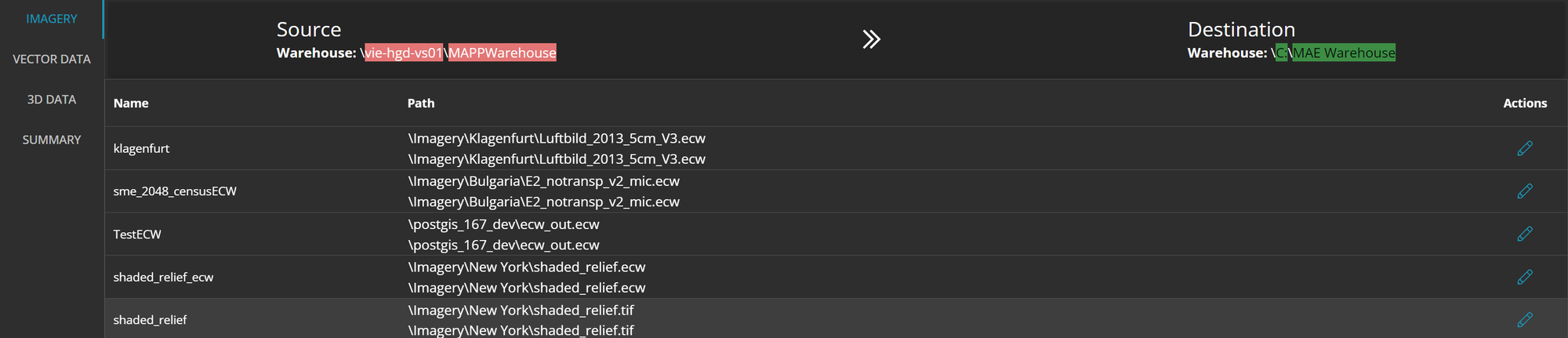 Raster data might also be present in the imported tenant, appearing under the Imagery section in the menu on the left. At the top, you'll notice the warehouse locations from both the source and destination, highlighted in red and green respectively if there are differences between them. Make changes to the paths, if desired, by clicking on the pen icon.