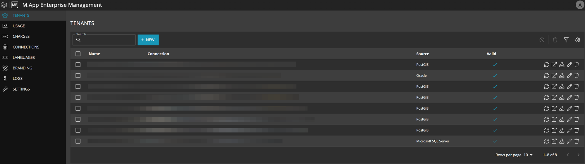 To get started, navigate to the Tenants section in the menu bar. You will get a list with all available tenants, their connection, source and validation.