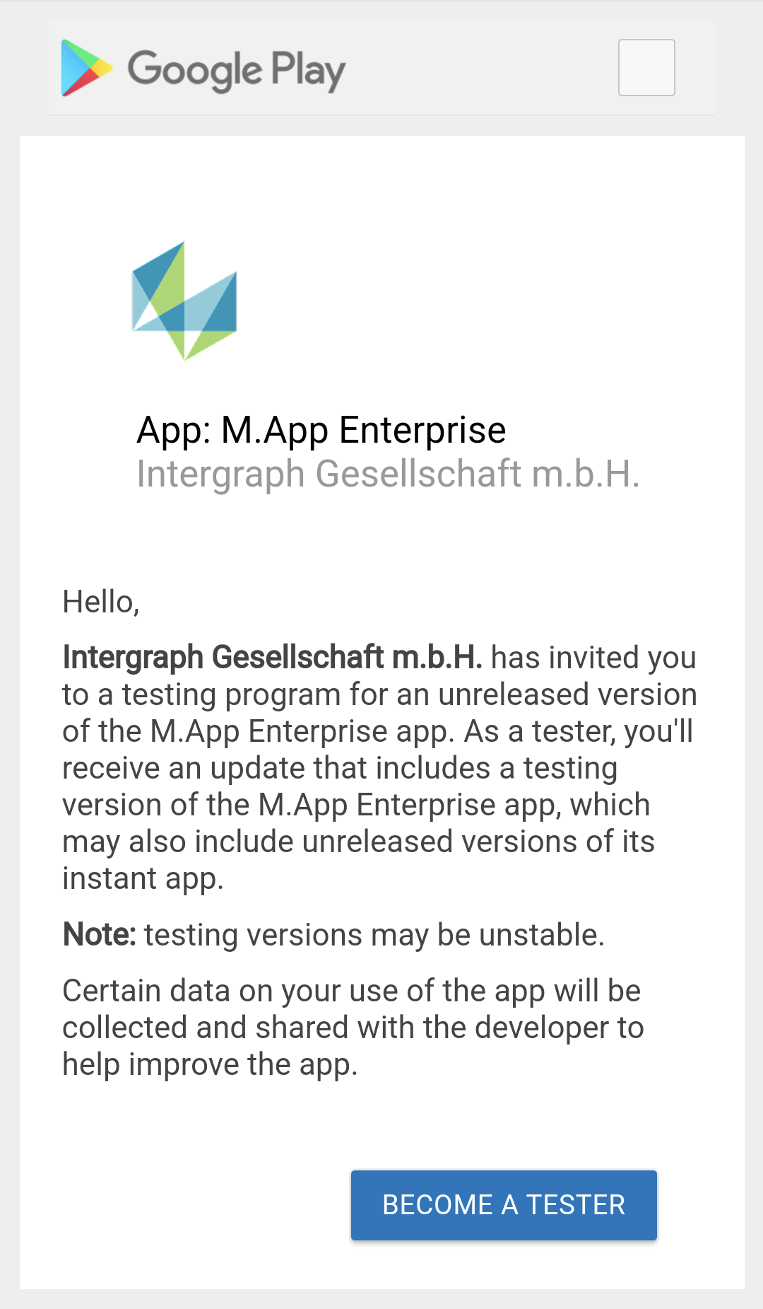 Before publishing the latest M.App Enterprise Mobile Client to the public app stores, it will be made available as beta in the app stores. This will help us to find regressions and get feedback on issues.
