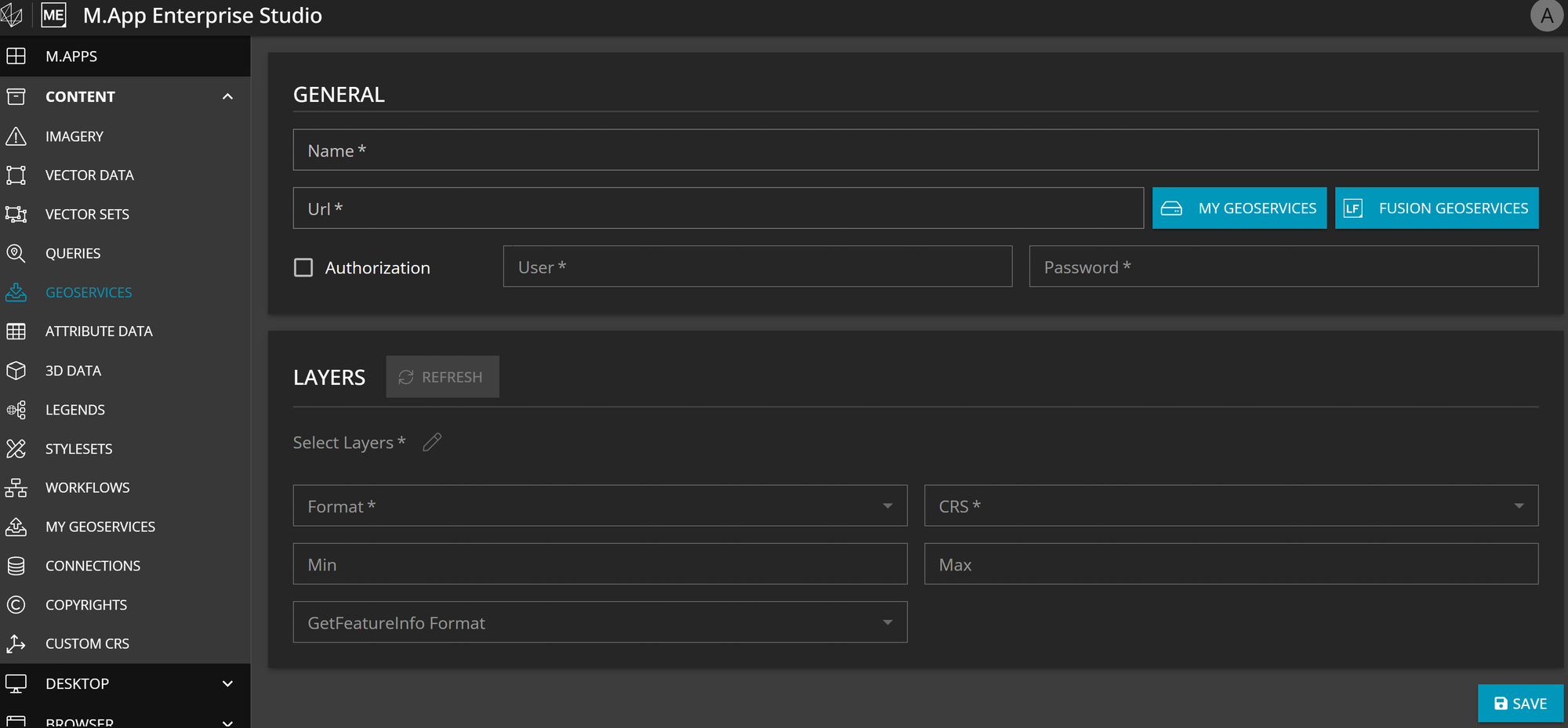 Web Map Services (WMS), Web Map Tile Services (WMTS) and Web Feature Services (WFS) are added in the same way. Within the Content menu of Studio, click on Geoservices and New and select the desired service type. The forms all look very similar like the image below for WMS: