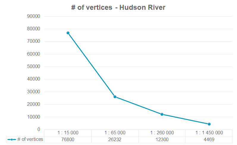 The "basic" QuadTree approach is taken for the creation of VectorSet cache but gets improved on several levels. Here the QuadTree is scale-dependent and is using geometry simplification in order to increase the performance and decrease the size and numbers of tiles. Geometry simplification is visible in the next screenshot, where the Hudson River in the state of New York is taken in consideration. You can see on the right hand side the different scales and how the number of vertices changes with it.