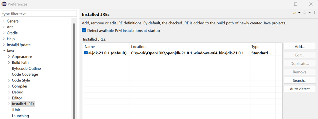 Window→Preferences→Java→Installed JREscontains the downloaded JDK asdefault(should happen automatically if the Java VM was set as recommended during the installation). If not, then add it and set it as default.