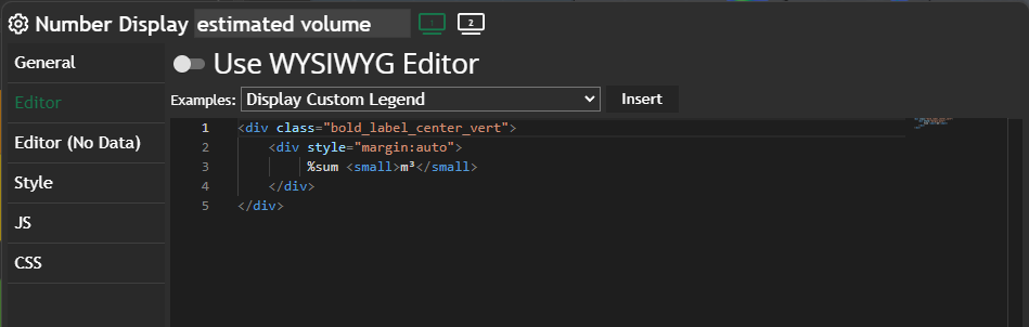 If you don't use the WhatYouSeeIsWhatYouGet (WYSIWIG) Editor, you will get a full-blown code editor with autocomplete and Intellisense. We define a%sum, which gives us automatically the total number of currently visible geometries in the Map widget.