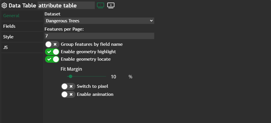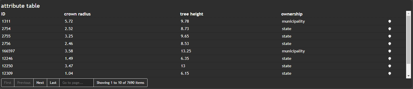 In this tab we change theChart title to attribute table and change the Features per Page to 7. We also use the slider Enable geoemtry highlight and Enable geometry locate, which allows us to zoom to a single entry and highlight this geometry in the map.