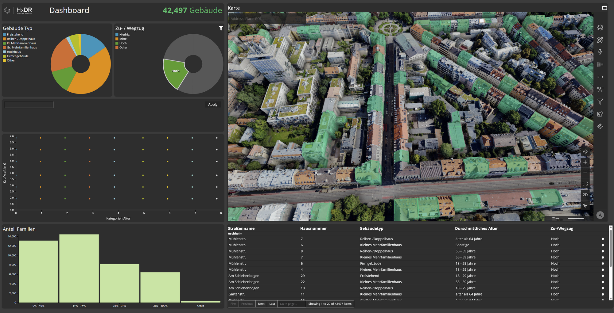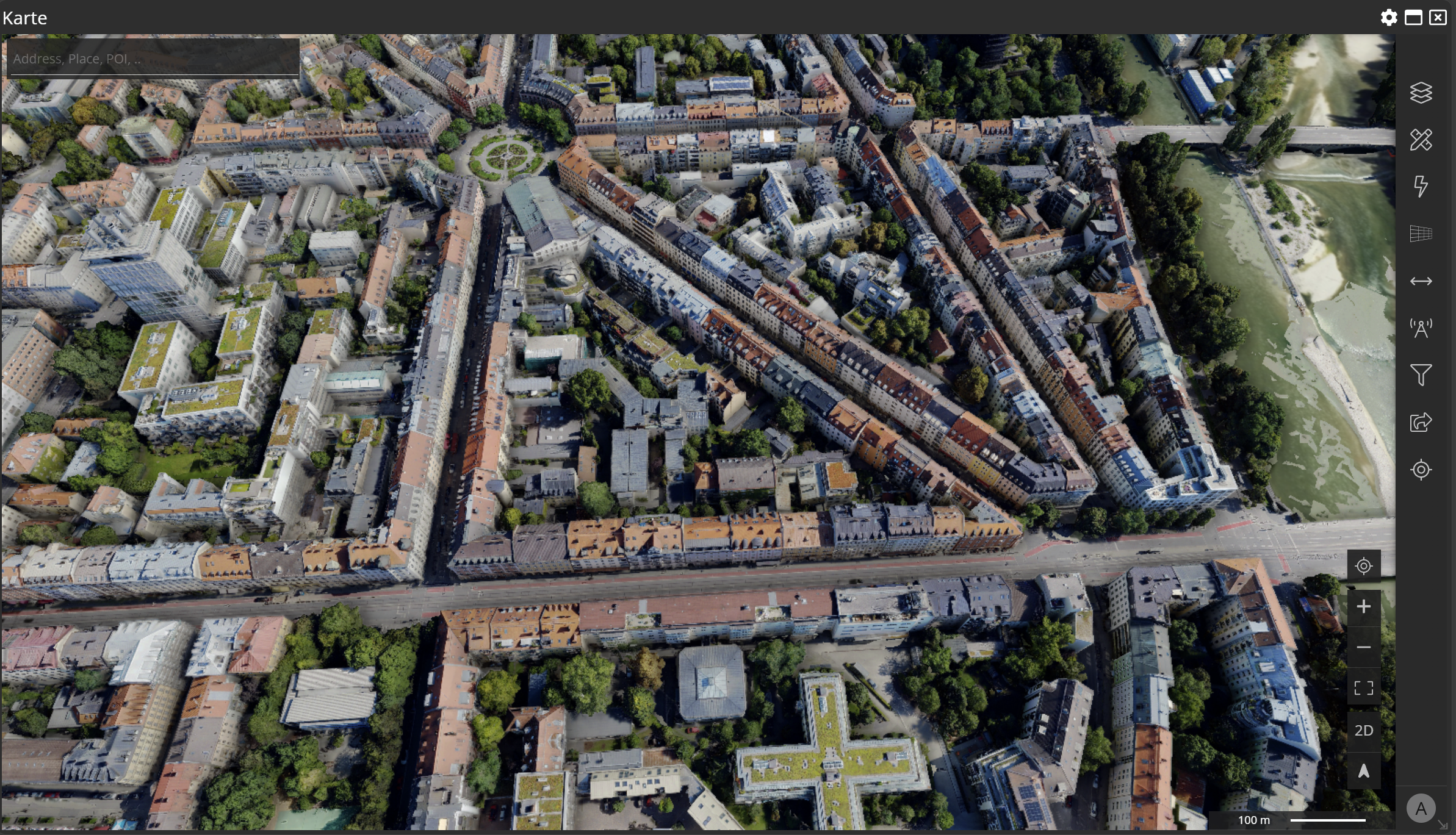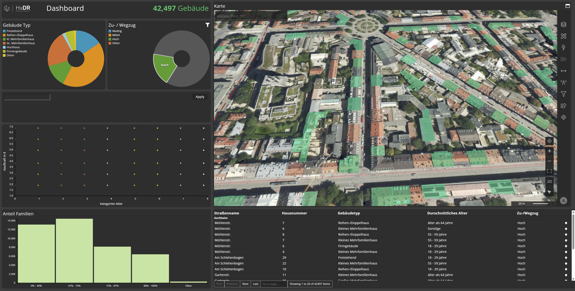In the dashboard above, all buildings within Munich are visualized according to user-defined filter criteria. It would be beneficial to also display the found objects within a 3D mesh. Therefore, let’s enable the mesh layer: