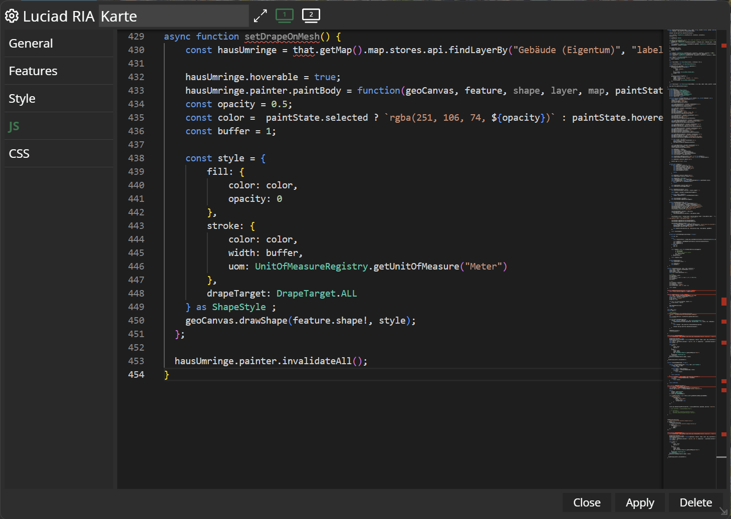 The same code snippet can be utilized in other M.App Enterprise Browser Applications to overlay vector data onto mesh data. For further information on rendering in RIA, please refer to the RIA Documentation Portal.