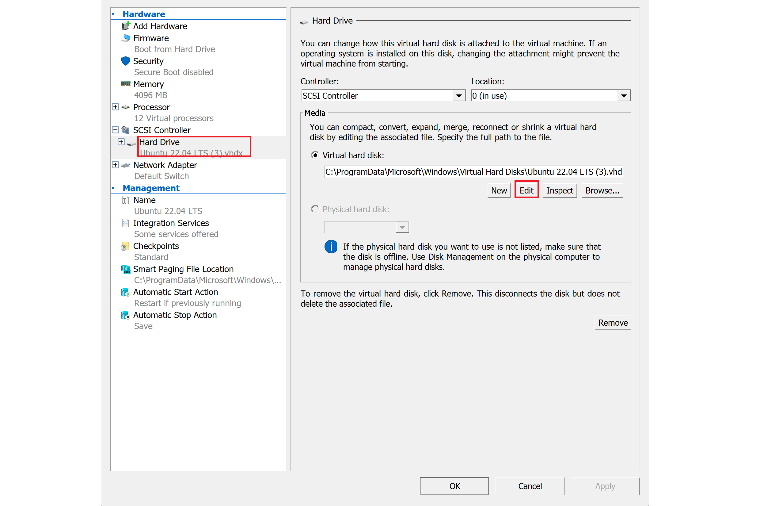 Shut down your machine and go to the settings of your VM in Hyper-V. Navigate to Hard Disk and click on Edit.