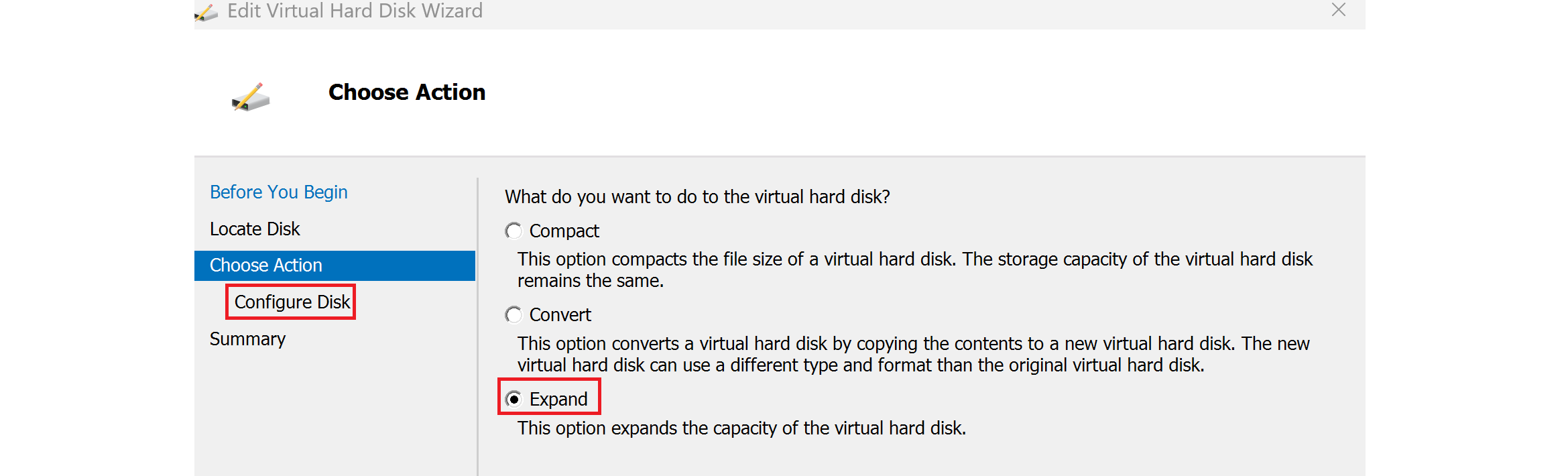 Navigate to Choose Action and select Expand from the options. The Configure Disk window will then appear. Click on it and increase the disk space as needed. 25GB in total will be sufficient to follow this post.