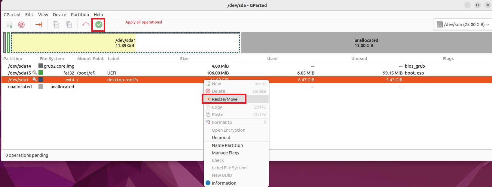 Right-click on the partition labeled desktop-rootfs, which has approximately 12 GB, and select resize/move. A panel will appear, allowing you to increase the partition size using the unallocated space you previously added in your virtual machine settings. Make sure to click the green tick icon Apply all operations to save the changes.