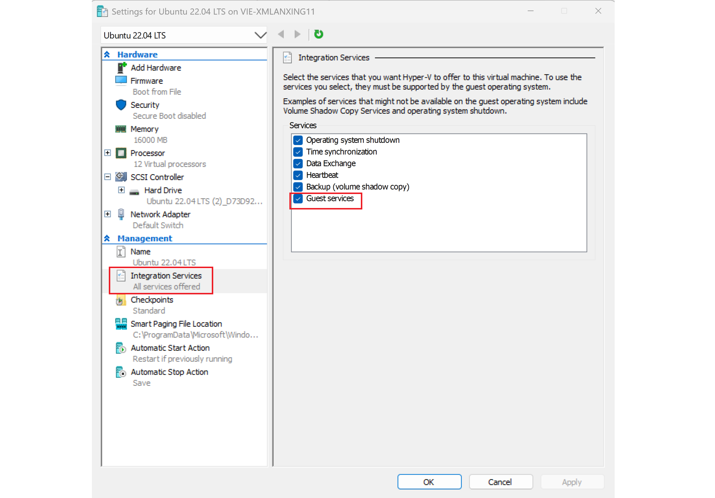 Thereafter, open the settings of your virtual machine and navigate to Integration Services, ensuring that Guest Services is checked.
