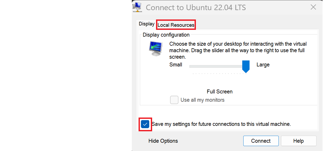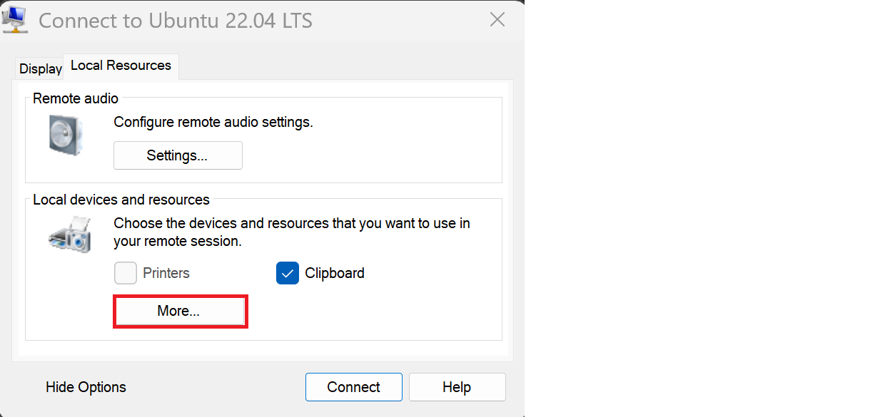 In the next step, right-click on your host and select Session settings. A small window will appear with display configuration options. Choose Show options and ensure that Save my settings for future connections to this virtual machine is checked. Then, navigate to the Local Resources tab, click on More, and select the drive you want to use for your virtual machine.