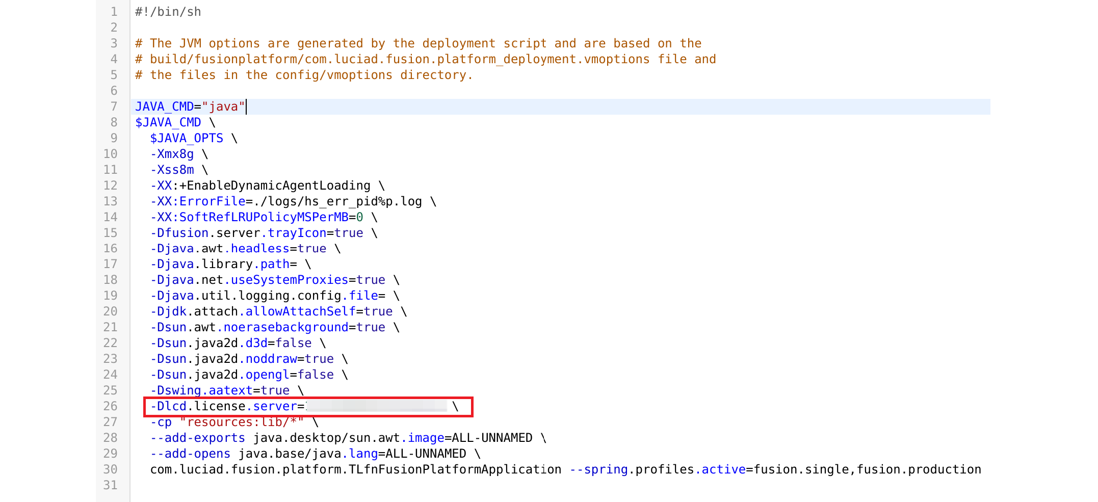 Add the license server variable to the StartFusionPlatformServer.sh file to ensure proper configuration. The file can be found directly within your Luciad Fusion setup folder.