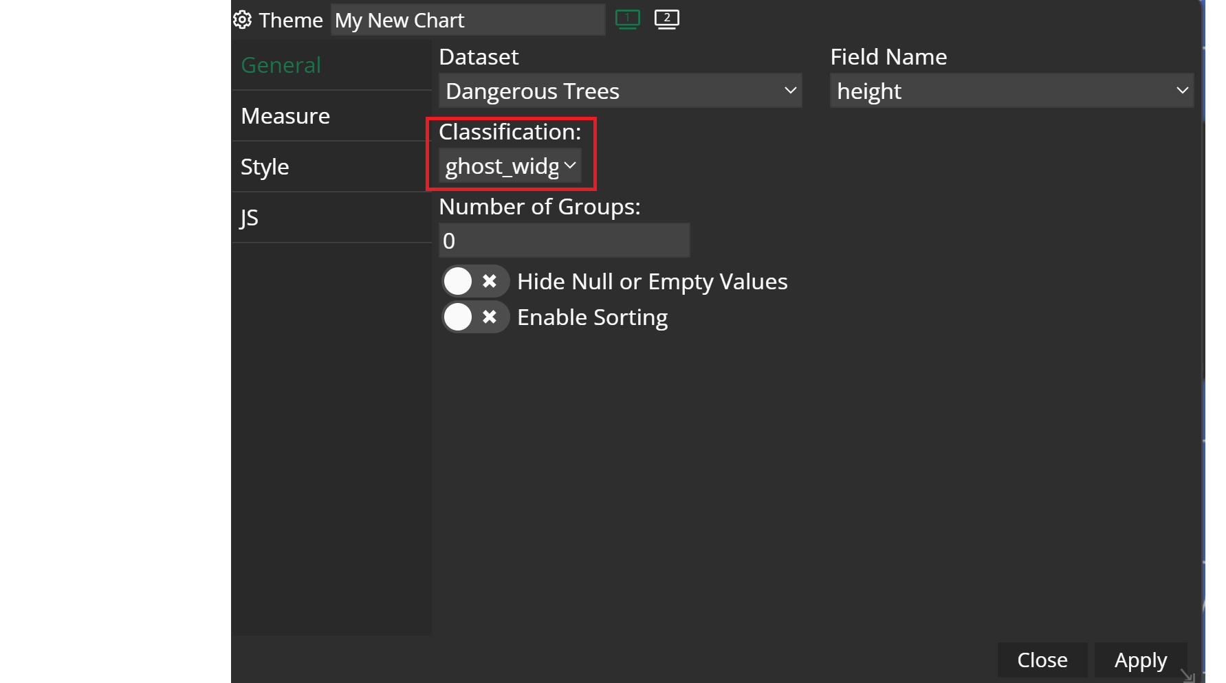 Thereafter, you can start and create a Theme widget. Use the according dataset and choose the attribute that matches your styleset. For the classification select your stylset and click apply. You will now see that the filters and colors of your map style are perfectly adjusted to the chart's coloring.