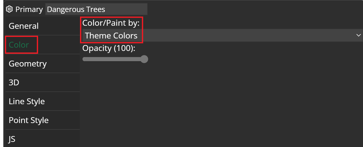 Navigate to the configuration menu of the Luciad RIA widget and click on settings icon next to your dataset within the features tab. You will be forwarded to the dataset configuration. There you have to navigate to the color tab and select Theme Colors for the Color/Paint by setting.