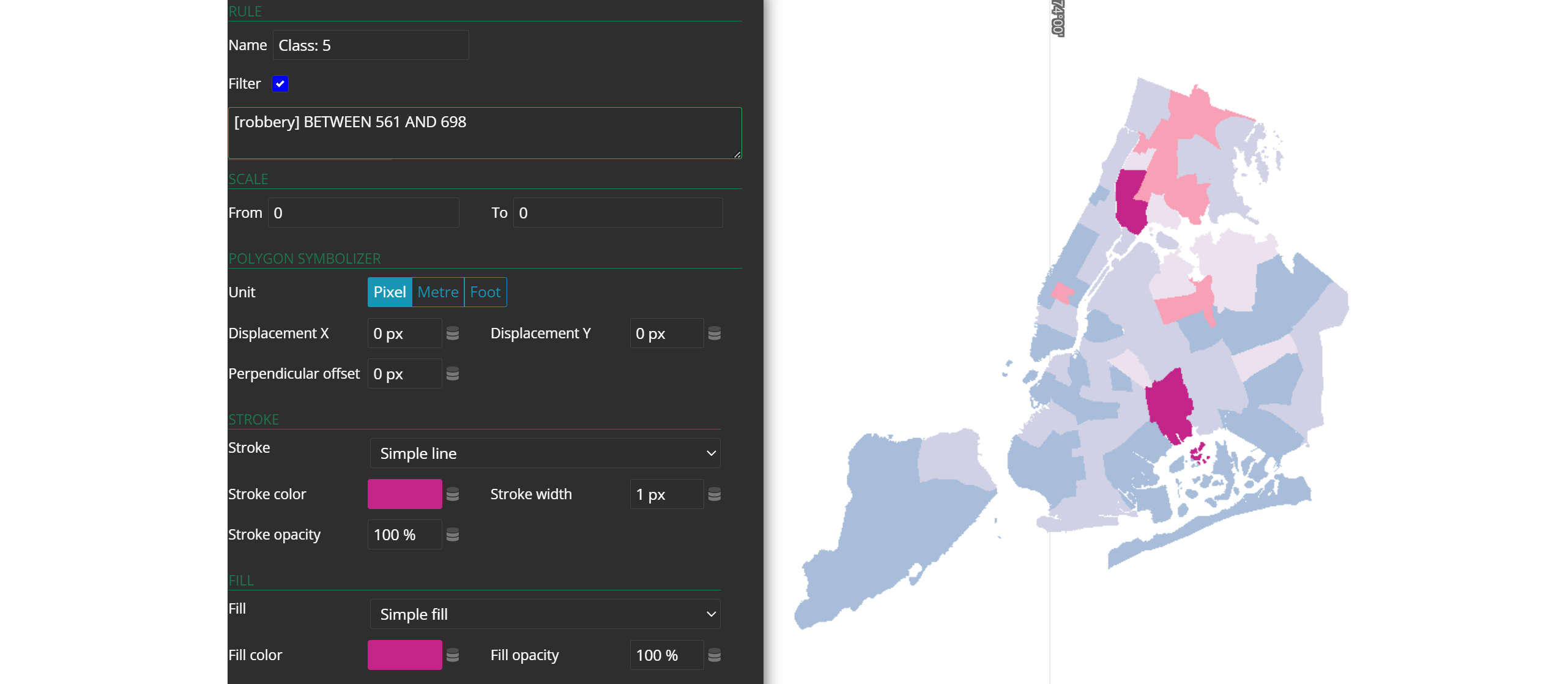 Open the style editor and select Boroughs from the unstyled layers list. Apply a simple, conventional style to the Boroughs layer. Use a black stroke color (#010101) and a stroke width of 1 pixel. This will give the Boroughs layer a basic, standard appearance.