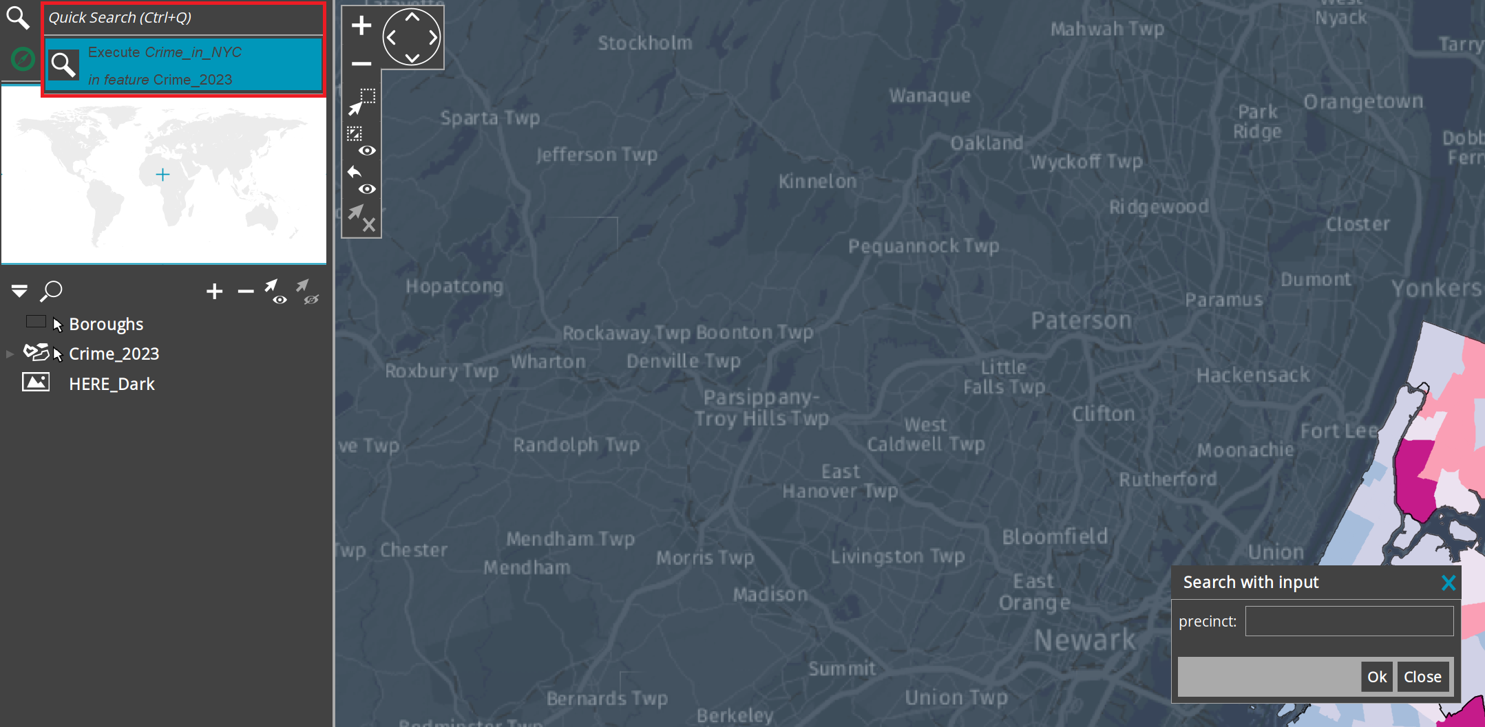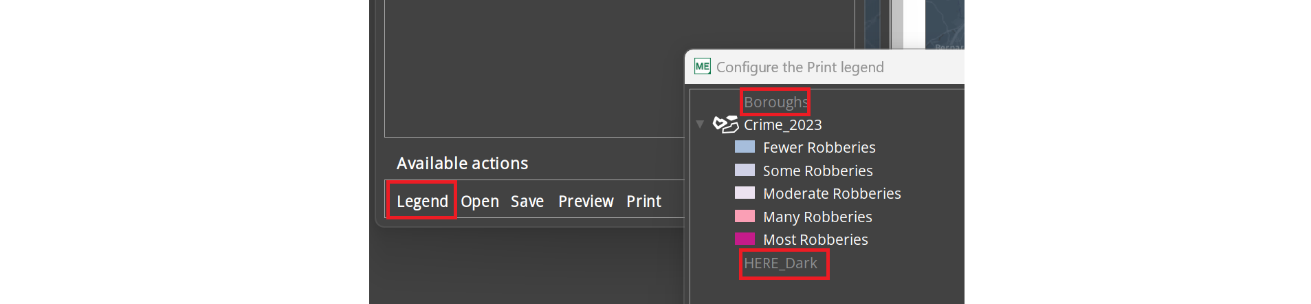 Click on Legend to open a panel with all the legend entries. With a double-click on "Boroughs" and "HERE_Dark" you can set these layers invisible on the legend.