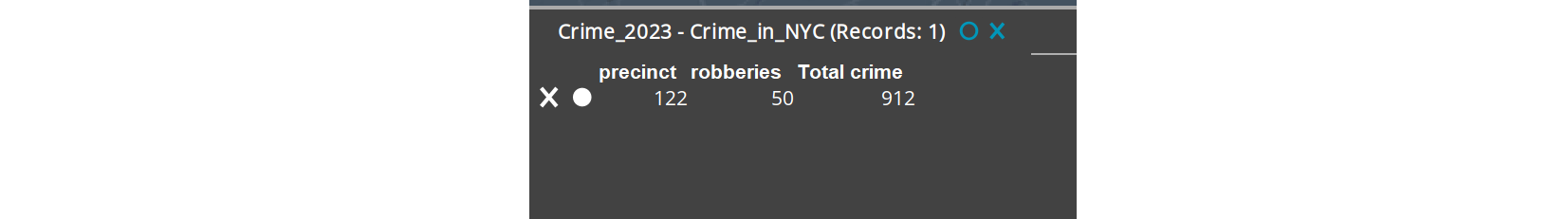SELECT precinct as Precinct, robbery as Robberies, total_crime as "Total crime" from crime_2023 where precinct = {ENTITY.precinct}