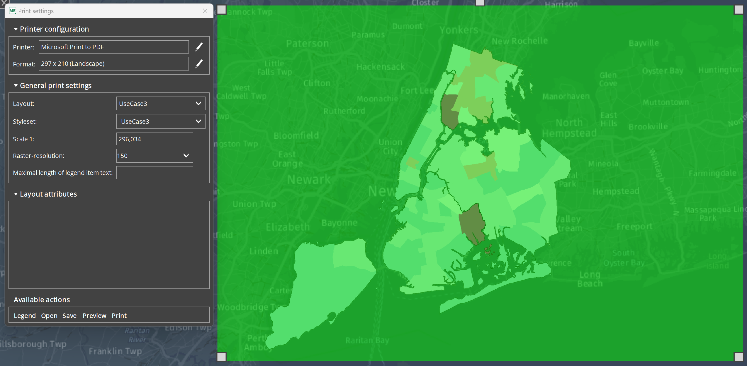 When you click OK, the print layout settings will open. The green area marks the area of the map view. You can adjust the map section by zooming in or out or moving the area. In our case, we move the map a little to the left and up so that the legend and title do not obscure the contents of the map.