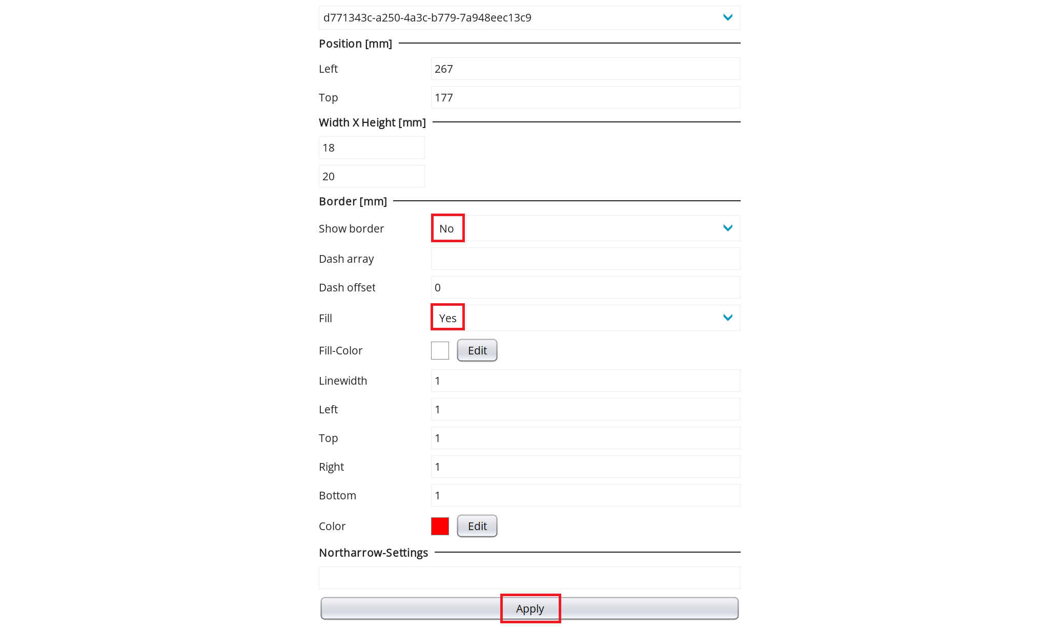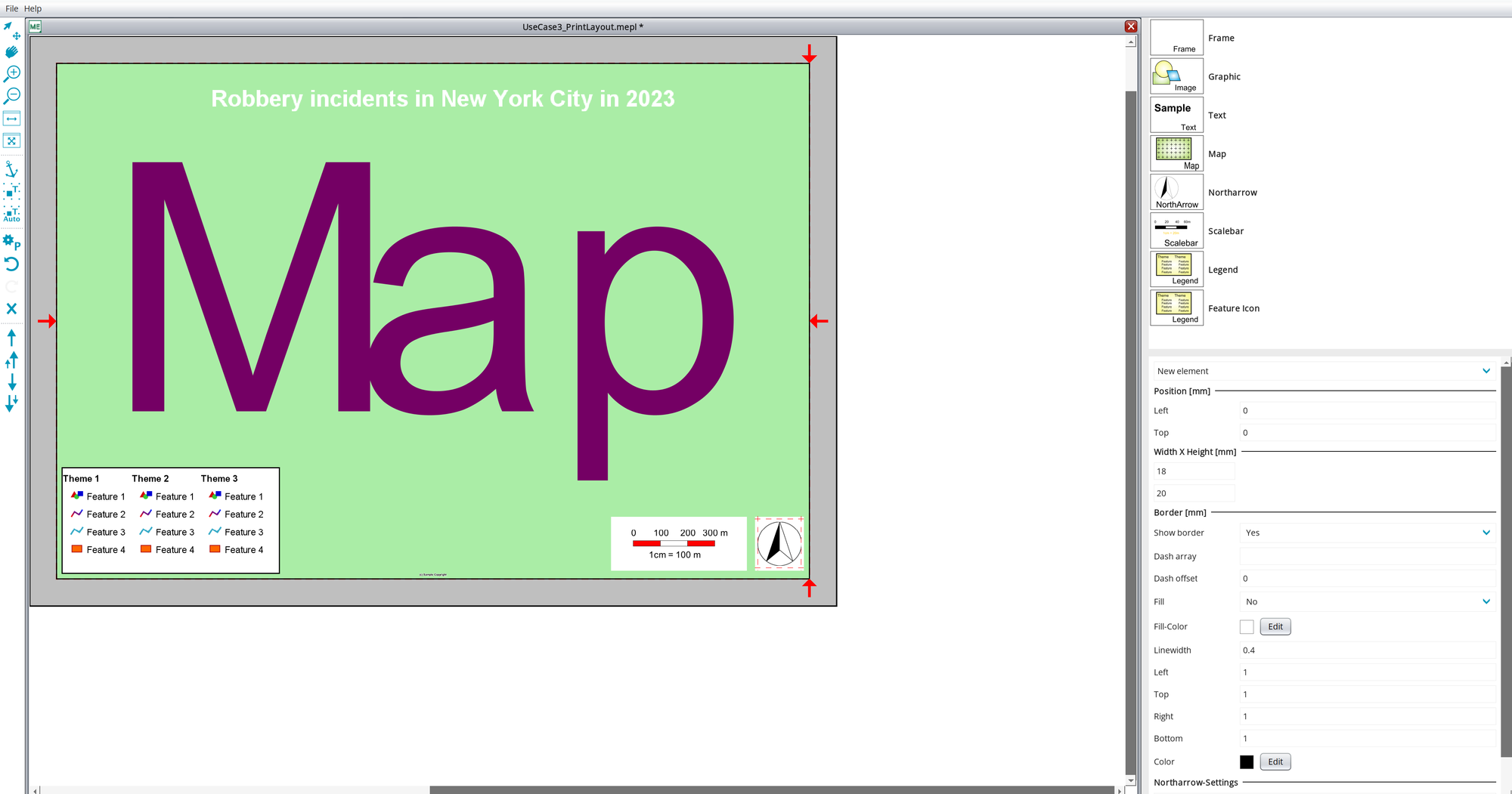 Northarrowelement from the left to the print layout page. Place it in the right bottom corner and leave a margin of about half a centimeter to both sides. In the settings on the right side change the dropdown toShow border: No,Fill: YesandApply.