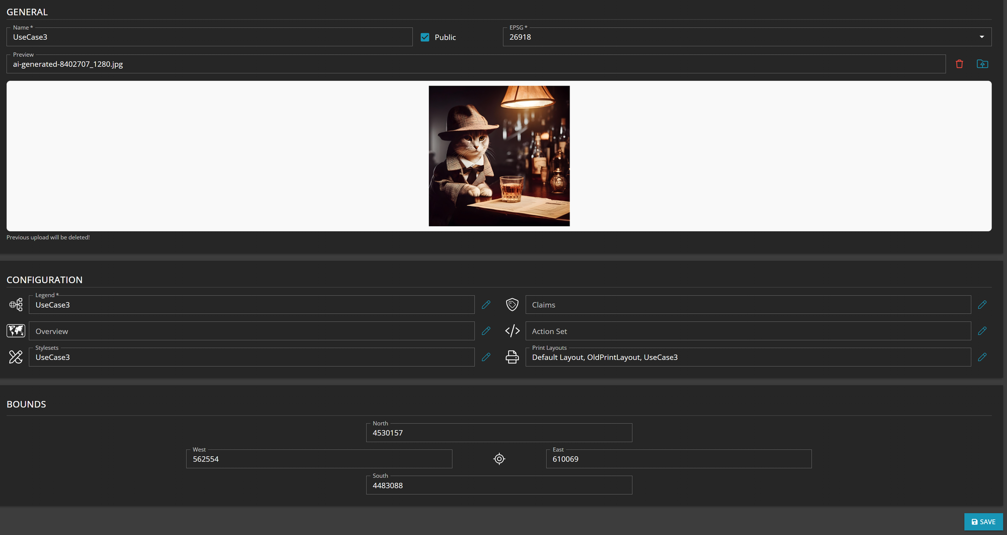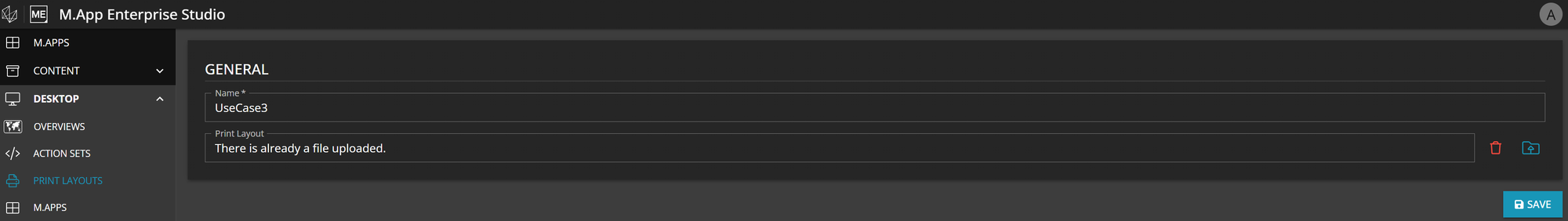 Upload the previously created Print Layout file from your drive here and assign a name like "UseCase3 PrintLayout". Save it and proceed with the next step.